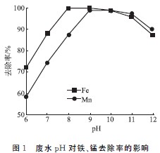 取200mL原水,向水樣中滴加石灰乳直至水樣不再出現(xiàn)綠色,繼續(xù)添加石灰乳,分別調節(jié)pH 為6、7、8、9、10、11、12,水氣比1∶15,曝氣10min后,加入0.4mL 15g/L多糖生物絮凝劑,以150r/min的轉速攪拌30s,靜置沉淀1min后取上清液測定金屬含量,并計算出鐵、錳的去除率,相關試驗結果見圖1。