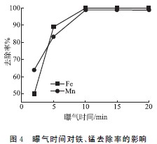 取200mL原水水樣,加石灰乳,調節(jié)pH 至9,氣水比為1∶10,分別設曝氣時間2min、5min、10min、15min、20min,曝氣結束后加入0.4mL微生物絮凝劑,以150r/min的轉速攪拌30s,靜置沉淀1min后取上清液測定鐵、錳含量,計算去除率,相關結果見圖4。