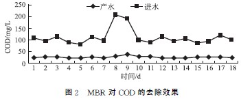 膜池進出水COD的變化見圖2。系統(tǒng)進水COD為80.8~207.3 mg/L,膜池出水COD為23.8~37.6mg/L,平均出水COD27.5mg/L。平均去除率為72.6%。膜出水COD較穩(wěn)定,受進水水質(zhì)波動影響不大。其中盡管第8d、第9d該廠來水異常,進水COD超過200mg/L,其去除效果仍然較好,MBR工藝的抗沖擊負荷能力較強。可見,膜本身的分離、截留能力比較強,起到穩(wěn)定出水的作用。