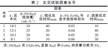 為得到因素的主次關系和最優(yōu)組合條件,本研究采用綜合平衡法對正交試驗結果進行直觀分析(計算過程及結果未予詳細列出,計算方法見參考文獻。綜合考慮計算得出的極差和指標的重要程度,最終選擇因素的主次順序為:泥水比>硫化反應時間>硫化鈉投加量>混凝反應時間>FeSO4投加量。綜合考慮指標的重要性和經濟性等因素,得到最優(yōu)組合條件為A1B3C2D3E4,即泥水比為14∶1,5%硫化鈉投加量為20 mL,硫化反應時間為20 min,5%FeSO4與廢水投加體積比為0.05,混凝反應時間為30 min。具體參見http://wlmqsb.com更多相關技術文檔。