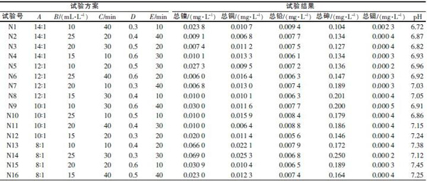試驗所用水樣采用實驗室配水。廢水水質:總鎳1.84 mg/L,總銅3.09 mg/L,總鉛3.36 mg/L,總砷24.46 mg/L,總鎘0.46 mg/L,CODCr 290 mg/L,pH1.06。