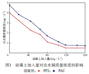 2.1 硅藻土加入量對(duì)出水銅質(zhì)量濃度的影響