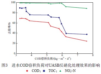 進(jìn)水COD容積負(fù)荷對(duì)UASB反硝化處理效果的影響見(jiàn)圖3。由圖3可見(jiàn):隨著進(jìn)水COD容積負(fù)荷的增加,UASB中COD去除率、TOC去除率和NO3--N去除率均逐漸下降;進(jìn)水COD容積負(fù)荷不超過(guò)6 kg/(m3·d)時(shí),COD去除率為42.7%~69.4%,TOC去除率為58.0%~90.0%,NO3--N去除率接近100%。