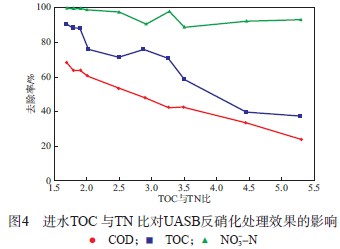 UASB運(yùn)行穩(wěn)定階段,進(jìn)水TOC 與TN 比對(duì)UASB反硝化處理效果的影響見(jiàn)圖4。