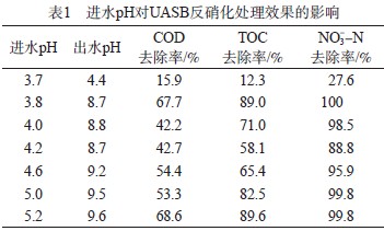 進(jìn)水pH對(duì)UASB反硝化處理效果的影響見(jiàn)表1。由表1可見(jiàn):當(dāng)進(jìn)水pH為3.8~5.2時(shí),COD去除率為42.2%~68.6%,TOC去除率為58.1%~89.6%,NO3--N去除率為88.8%~100%;當(dāng)進(jìn)水pH為3.7時(shí),出水pH為4.4,COD去除率只有15.9%,TOC去除率為12.3%,NO3--N去除率為27.6%,反硝化反應(yīng)無(wú)法順利進(jìn)行;隨著進(jìn)水pH的升高,出水pH也逐漸升高。由于本工作需要對(duì)UASB出水進(jìn)行進(jìn)一步的好氧生化處理,為保證后續(xù)處理的順利進(jìn)行,UASB進(jìn)水pH可調(diào)節(jié)為4.5左右。