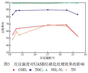 反應(yīng)溫度對(duì)UASB反硝化處理效果的影響見(jiàn)圖5。由圖5可見(jiàn),反應(yīng)溫度為18~34 ℃時(shí),COD去除率、TOC去除率、NO3--N去除率及TN去除率均變化不大,說(shuō)明反應(yīng)溫度在一定范圍內(nèi)波動(dòng)對(duì)UASB反硝化處理效果影響不大。