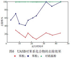 UASB對(duì)苯系化合物的去除效果見(jiàn)圖6。由圖6可見(jiàn):UASB對(duì)苯胺的去除率最低,平均去除率為19.0%;隨著UASB的運(yùn)行,UASB對(duì)苯酚的去除率逐漸升高,最高可達(dá)100%;UASB對(duì)對(duì)硝基酚的去除效果最好,對(duì)硝基酚去除率一直接近100%;可見(jiàn)UASB對(duì)苯系化合物的去除率從高至低順序?yàn)閷?duì)硝基酚>苯酚>苯胺。