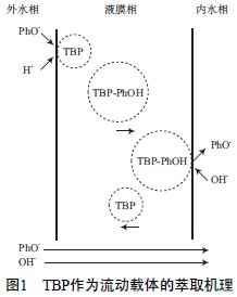 TBP作為流動(dòng)載體的萃取機(jī)理見圖1。由圖1可見,以苯酚為外水相、TBP作為載體的液膜相、NaOH溶液為內(nèi)水相,苯酚分子在外水相中向界面擴(kuò)散,在界面處發(fā)生絡(luò)合反應(yīng),形成TBP-PhOH,由于濃度梯度動(dòng)力的存在,絡(luò)合物TBP-PhOH向內(nèi)水相界面遷移,并在該界面處發(fā)生解絡(luò)反應(yīng),生成的苯酚陰離子進(jìn)入到內(nèi)水相中,而再生的載體TBP再因濃度梯度的動(dòng)力遷移到外水相界面處,形成一個(gè)循環(huán)過(guò)程,不斷地將PhOH由外水相遷移到內(nèi)水相中。
