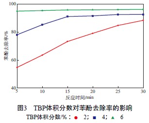 2.2 載體TBP的體積分?jǐn)?shù)對(duì)苯酚去除率的影響