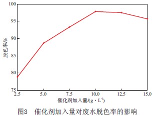 在初始酸性大紅GR質(zhì)量濃度為200 mg/L、H2O2加入量為1.5 mL/L、廢水pH為4、反應(yīng)時間為2 h的條件下,催化劑加入量對廢水脫色率的影響見圖3。由圖3可見:隨著催化劑加入量的增加,廢水脫色率逐漸提高;當(dāng)催化劑加入量為10.0 g/L時,廢水脫色率為97.77%;繼續(xù)增加催化劑加入量,廢水脫色率反而有所降低。這是因為催化劑加入量過多時,UV光照受阻。因此,本實驗選擇催化劑加入量為10.0 g/L。