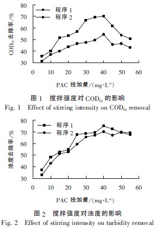 試驗(yàn)設(shè)定2 個(gè)混凝攪拌程序。程序1 設(shè)定為:中速攪拌(100 r/min) 2min;慢速攪拌(30 r/min) 5min;程序2 設(shè)定為:快速攪拌(200 r/min) 1min;慢速攪拌(40 r/min) 8min。向1 L水樣中投加不同劑量的PAC,分別在2 種條件下攪拌,靜置一段時(shí)間后測(cè)CODCr濃度和濁度,計(jì)算對(duì)應(yīng)的去除率。