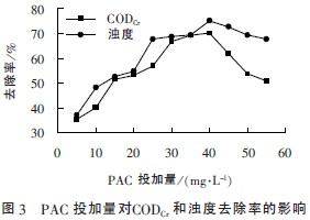 由圖3 可知,當(dāng)PAC 的投加量為5~40mg/ L時(shí),CODCr和濁度的去除率均隨投加量的增加而明顯上升。投加量為40mg/ L 時(shí),混凝效果最好,CODCr和濁度的去除率分別為70%和75%。故PAC 的最佳投加量為40mg/ L。