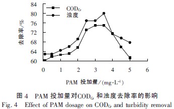 由圖4 可知,當(dāng)PAM 的投加量為0.1~3.5mg/L 時(shí),CODCr和濁度的去除率明顯上升。當(dāng)PAM 的投加量為3.5mg/ L 時(shí),混凝處理效果最佳,CODCr和濁度的去除率最高可分別達(dá)到75%和80%。