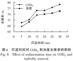 由圖6 可知,CODCr和濁度的去除率均隨著沉淀時(shí)間的延長(zhǎng)而上升,上清液也越來(lái)越清澈,但達(dá)到一定沉淀時(shí)間后,去除率的上升就不明顯了。沉淀時(shí)間在5~15min 內(nèi),CODCr和濁度的去除率上升較快,15min 后CODCr和濁度的去除率雖然也有所上升,但變化幅度不到4%。因此最佳沉淀時(shí)間為15min。