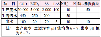 該廢水組分復(fù)雜,有機(jī)污染物濃度高,BOD5/COD 值<0.25,屬于難生化降解廢水,廢水中SS 濃度高且含有一定濃度的表面活性劑、動(dòng)植物油類。