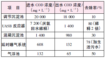 工程調(diào)試的重點(diǎn)在于UASB 厭氧反應(yīng)系統(tǒng)的啟動(dòng),關(guān)鍵在于控制UASB 不發(fā)生酸化。UASB 啟動(dòng)直接購(gòu)買顆粒污泥進(jìn)行接種,接種量為150m3。啟動(dòng)初期采用間隙進(jìn)水方式,進(jìn)水量為150m3/d,利用出水回流稀釋進(jìn)水COD 在4 000 ~ 5 000mg/L,通過蒸汽加熱保證進(jìn)水溫度略高于37 ℃,投加NaOH 控制pH 值為7.2 ~ 7.5,能夠有效防止由于容積負(fù)荷的提高所引起的反應(yīng)器酸化,投加氮源、磷源以及必需的微量元素以保證進(jìn)水中C ∶ N ∶ P 為200 ∶ 5 ∶ 1。啟動(dòng)階段UASB 出水VFA < 200mg/L,沒有出現(xiàn)積累現(xiàn)象,表明UASB 中產(chǎn)甲烷菌活性較好,生化處理效果良好。UASB 啟動(dòng)時(shí)間短,一個(gè)月左右達(dá)到了設(shè)計(jì)容積負(fù)荷,進(jìn)水COD 濃度經(jīng)稀釋后為7 200mg/L,出水為1 400mg/L,去除率>80%。延時(shí)曝氣池接種污泥采用當(dāng)?shù)匚鬯幚韽S的好氧污泥,運(yùn)行穩(wěn)定后污泥濃度為4 000mg/L,控制污泥回流比為100%。延時(shí)曝氣池進(jìn)水COD 濃度約為600mg/L,出水為132mg/L,去除率>78%。