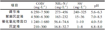 完成馴化后,廢水處理系統(tǒng)進(jìn)入穩(wěn)定運(yùn)行階段。為了檢測(cè)系統(tǒng)運(yùn)行效果,在調(diào)節(jié)池、絮凝沉淀池出口、催化氧化塔出口和沉淀池出口設(shè)置取樣點(diǎn)進(jìn)行監(jiān)測(cè),結(jié)果如表2 所示。