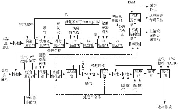 廢水處理的總體工藝思路為: ①對(duì)部分超高鹽度廢水作脫鹽預(yù)處理,將總鹽度控制在7 000 mg/L以內(nèi),確保對(duì)生化處理系統(tǒng)沒有明顯的抑制作用; ②污污分治,有針對(duì)性地對(duì)高濃度廢水進(jìn)行預(yù)處理后,再與低濃度廢水混合進(jìn)行生化處理; ③高濃度廢水預(yù)處理要削減一定的有機(jī)污染物,更重要的目的是改善廢水的可生化性; 高濃度廢水呈強(qiáng)酸性,且含有大量的鐵離子,采用鐵碳微電解-芬頓高級(jí)氧化-絮凝沉淀工藝,可使耗酸量大大降低,延長(zhǎng)鐵碳使用周期; ④將事故池一分為二,增加高濃度廢水處理事故池,高濃度廢水預(yù)處理如未能實(shí)現(xiàn)設(shè)計(jì)目標(biāo),將不進(jìn)入后續(xù)廢水處理系統(tǒng),而是回到高濃度廢水處理事故池,再返回到預(yù)處理段,可減少水質(zhì)的波動(dòng)性; ⑤由于高、低濃度廢水混合后COD 依然很高,采用UASB 進(jìn)行厭氧處理,削減COD 處理負(fù)荷; ⑥削減氨氮主要利用A/O 工藝,由于硝化反硝化的最重要因素就是穩(wěn)定,故在厭氧之后,A/O之前增加生物活性炭法(PACT) ,即在好氧系統(tǒng)中投加一定量的粉末活性炭,并隨著污泥回流提高難降解有機(jī)物去除效果和系統(tǒng)的抗毒性能力,形成O/A/O 工藝。對(duì)氨氮以生化處理為主,要保證高、低濃度廢水混合后氨氮小于300 mg/L,但超過600 mg/L的高氨氮廢水,要先進(jìn)行物化脫氨處理,采用磷酸銨鎂法; ⑦由于出水水質(zhì)要求高,利用MBR 工藝長(zhǎng)污泥齡和高污泥負(fù)荷特點(diǎn)將生化處理發(fā)揮到極致。且由于化工廢水的特性,有時(shí)生化出水BOD5降解到位,但COD 仍然可能超標(biāo),故考慮增設(shè)化學(xué)氧化處理作為保安手段,確保出水穩(wěn)定達(dá)標(biāo)排放。