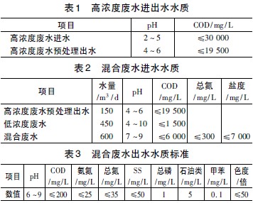 高濃度廢水預(yù)處理系統(tǒng)只控制COD,考慮到混合廢水處理中生化處理系統(tǒng)的承受能力,在與低濃度廢水混合后,對(duì)進(jìn)水鹽度和總氮有限制要求,混合廢水最終出水執(zhí)行《化學(xué)合成類制藥工業(yè)水污染物排放標(biāo)準(zhǔn)》(GB 21904-2008) ,各廢水水質(zhì)分別見表1~表3,工藝流程見圖1。