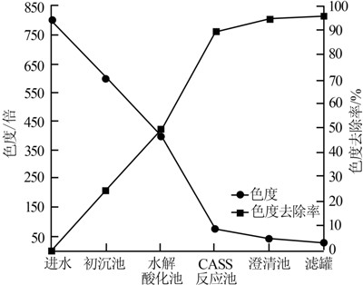 由圖 5可知,在系統(tǒng)正常運(yùn)行過程中,初沉池、水解酸化池、CASS反應(yīng)池、澄清池和濾罐的平均出水色度分別約為600、400、80、40、30 mg/L,整個(gè)系統(tǒng)色度總?cè)コ士蛇_(dá)96.3%,處理效果較好。