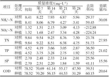 對于廢水中磷元素的變化,從表 1可知,無論是種植組還是對照組,廢水中TP和SP濃度都隨時間的延長而逐漸降低。對照組的TP含量降低是由于污水中的顆粒沉降而將磷帶入水體下部,但污水中漂浮種植植物之后TP、SP含量都顯著降低,并且都顯著低于對照組同一時期的含量,與初始的濃度比較,在種植生菜28 d之后,種植生菜對TP、SP去除率的貢獻量分別達21.02%、15.56%。可見,飄浮種植生菜對TP、SP的去除效果很顯著。