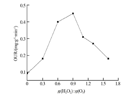 在反應(yīng)溫度20 ℃、廢水初始OUR為0、pH為10.5、反應(yīng)時間30 min、臭氧投加量4.2 mmol/L的條件下,考察n(H2O2)∶n(O3)對廢水可生化性的影響,結(jié)果見圖 2。相同實驗條件下單獨臭氧氧化出水OUR為0.093 mg/(g·min),單獨雙氧水氧化出水的OUR為0.08 mg/(g·min),而n(H2O2)∶n(O3)為0.3、