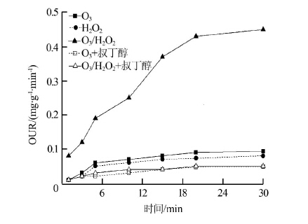 由圖 3可知,反應(yīng)時間為30 min時單獨臭氧氧化出水的OUR為0.093 mg/(g?min),加入15 mg/L叔丁醇后出水OUR下降為0.04 mg/(g·min)。在臭氧氧化工藝中加入雙氧水后,廢水的可生化性明顯提高,反應(yīng)30 min后出水OUR升高到0.45 mg/(g·min),而向水中引入15 mg/L叔丁醇后廢水的可生化性明顯降低,低于臭氧和雙氧水分別單獨氧化時的水平。由此表明叔丁醇的存在有效抑制了水中羥基自由基的生成。實驗結(jié)果間接證明在雙氧水與臭氧協(xié)同氧化過程中,雙氧水能夠加速臭氧分解產(chǎn)生羥基自由基,鏈?zhǔn)椒磻?yīng)見式(1)~式(6),羥基自由基進(jìn)而氧化廢水中的有機(jī)物,從而提高廢水的可生化性。