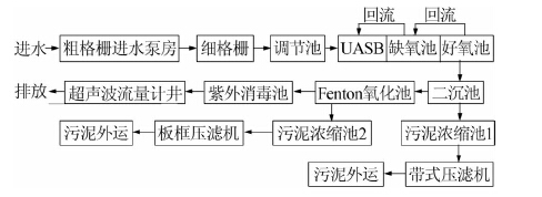針對(duì)該工業(yè)園區(qū)廢水的特點(diǎn),采用UASB+A/O+Fenton氧化工藝進(jìn)行處理,經(jīng)工程實(shí)踐證明此工藝成熟,治理效果穩(wěn)定。其中深度處理Fenton池是保證該工藝出水COD穩(wěn)定<90 mg/L的關(guān)鍵。