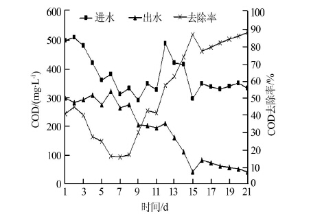 有機(jī)物降解速率主要受氧濃度與生物動(dòng)力學(xué)氧化速率控制。生物接觸氧化處理廢水的關(guān)鍵在于是否有足夠數(shù)量的生物膜附著在填料上,是否存在大量的藻類和原后生動(dòng)物,是否有一定量的絲狀菌能固定膜上生物等。因此掛膜快慢和掛膜質(zhì)量好壞是決定生物接觸氧化池啟動(dòng)成敗的重要影響因素。本工程投入污泥3 d后填料上即生成極薄的生物膜,進(jìn)行顯微鏡觀察發(fā)現(xiàn)有個(gè)別的豆形蟲(chóng),隨著營(yíng)養(yǎng)的不斷補(bǔ)充,生物膜不斷增厚,鏡檢原生動(dòng)物的種類也大大增加,草履蟲(chóng)、鐘蟲(chóng)等先后出現(xiàn),進(jìn)入第8天后鐘蟲(chóng)數(shù)量減少,盾纖蟲(chóng)、吸管蟲(chóng)、輪蟲(chóng)等原生動(dòng)物出現(xiàn),菌膠團(tuán)發(fā)育良好,出水COD降至200 mg/L。啟動(dòng)過(guò)程中接觸氧化池進(jìn)出水COD和去除率的變化情況如圖 3所示。