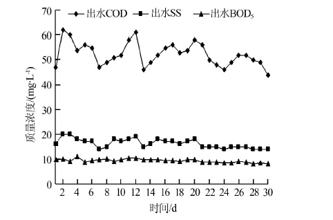 該處理系統(tǒng)經(jīng)過(guò)3個(gè)多月的運(yùn)行后,設(shè)備運(yùn)轉(zhuǎn)正常,整個(gè)系統(tǒng)一直處于穩(wěn)定狀態(tài),當(dāng)進(jìn)水COD在 1 560~2 490 mg/L,BOD5在620~880 mg/L,SS在150~200 mg/L時(shí),出水COD<62 mg/L,BOD5<20 mg/L,SS<11 mg/L,出水水質(zhì)可達(dá)到設(shè)計(jì)要求。2012年6月該系統(tǒng)出水COD、BOD5、SS變化情況見(jiàn)圖 4。