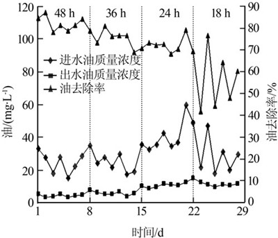 由圖 1可以看出,進(jìn)水中油質(zhì)量濃度在20~60 mg/L時(shí),原油去除率隨停留時(shí)間的增加而提高,不同停留時(shí)間下,出水中油質(zhì)量濃度均低于10 mg/L。其中水力停留時(shí)間為48 h時(shí),原油去除率可達(dá)到82%,平均出水油質(zhì)量濃度為4.3 mg/L,這也基本說明了含油污水的生化降解速率較低,需要較長(zhǎng)時(shí)間降解的結(jié)論。實(shí)驗(yàn)表明,工藝較適合的停留時(shí)間為24 h,該段實(shí)驗(yàn)內(nèi),在日均進(jìn)水油質(zhì)量濃度為39.6 mg/L時(shí),出水油質(zhì)量濃度在10 mg/L左右。
