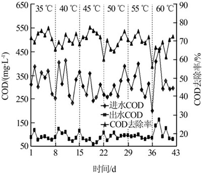 選定工藝停留時(shí)間為24 h,采用整體工藝分階段升溫方式,考察溫度對(duì)處理效果的影響,試驗(yàn)分為6個(gè)階段,共歷時(shí)2個(gè)月。其中溫度為35~60 ℃,每間隔5 ℃作為一個(gè)考察階段,試驗(yàn)的每個(gè)階段首日升溫2 ℃,次日升溫3 ℃,穩(wěn)定運(yùn)行1 d后進(jìn)行一周的監(jiān)測(cè),實(shí)驗(yàn)結(jié)果見圖 2、圖 3。