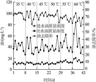 實(shí)驗(yàn)過程中發(fā)現(xiàn),運(yùn)行溫度達(dá)到55 ℃及以上時(shí),從表觀上來看,水解酸化及缺氧段反應(yīng)器生物膜的生長(zhǎng)情況良好,但接觸氧化反應(yīng)器由于受到溫度條件的抑制,出現(xiàn)膜脫落現(xiàn)象。延長(zhǎng)適應(yīng)時(shí)間后,在溫度提高到60 ℃時(shí)未出現(xiàn)系統(tǒng)崩潰的情況。在該反應(yīng)器穩(wěn)定運(yùn)行階段,COD和石油類的去除率均在70%左右,并沒有因?yàn)闇囟鹊纳仙忻黠@變化,表現(xiàn)出普通生物污泥馴化后處理含油污水較好的高溫適應(yīng)能力。