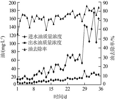 (3)生物法處理該稠油污水時(shí),進(jìn)水油質(zhì)量濃度低于40 mg/L很重要,也是污水能否處理達(dá)標(biāo)排放的關(guān)鍵。