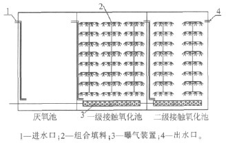 生物接觸氧化法兼有活性污泥法及生物膜法的特點,池內(nèi)具有較高的容積負荷〔可達2.0 ~3.0kg/(m3·d)〕,另外接觸氧化工藝不需要污泥回流,無污泥膨脹問題,運行管理較活性污泥法簡單,對水量水質(zhì)的波動有較強的適應能力,適用于含鹽有機廢水的處理。