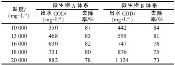 實驗使用微生物A 體系,在進水鹽度低于13 000mg/L,進水COD 低于3 000 mg/L 時,出水COD<450mg/L,達到食品行業(yè)廢水排入污水處理廠的排放標準(遼寧省污水綜合排放標準,DB 21/1627—2008)。體系B 在進水鹽度低于10 000 mg/L,進水COD 低于2 700 mg/L 時,出水才能達到上述排放標準。
