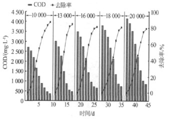 分別通過稀釋原水的方法配制成不同鹽度的多個等級的進水。相應的水中COD 也發(fā)生變化。