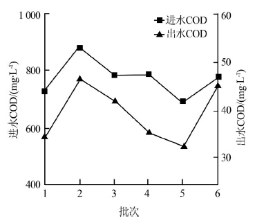由圖 2可見,當進水COD為694~888 mg/L時,出水COD為32~47 mg/L,對有機物的去除率達到94.3%~95.6%,這是因為冷凝液中的小分子有機物大部分屬于易生物降解的物質。