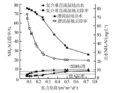 由圖 1可見,兩種人工濕地床的出水COD與水力負(fù)荷有密切關(guān)系,出水COD均隨水力負(fù)荷的提高而增大。水力負(fù)荷為0.167 m3/(m2·d)時(shí)濕地床出水COD均優(yōu)于《地表水環(huán)境質(zhì)量標(biāo)準(zhǔn)》(GB 3838— 2002)(以下簡(jiǎn)稱水體)Ⅲ(20 mg/L)類水體標(biāo)準(zhǔn),說明在此工況下人工濕地對(duì)COD達(dá)到十分顯著的去除效果。水力負(fù)荷<0.5 m3/(m2·d)時(shí),濕地床對(duì)碳源均有較好的去除效果,COD去除率均在70%以上,出水均優(yōu)于《城鎮(zhèn)污水處理廠污染物排放標(biāo)準(zhǔn)》(GB 18918—2002)(以下簡(jiǎn)稱標(biāo)準(zhǔn))一級(jí)A(50 mg/L)標(biāo)準(zhǔn)。繼續(xù)增加水力負(fù)荷達(dá)到0.725 m3/(m2·d),潛流人工濕地床對(duì)COD仍可達(dá)到很好的去除效果,COD去除率為80.25%,出水COD為33 mg/L,出水水質(zhì)優(yōu)于一級(jí)A(50 mg/L)標(biāo)準(zhǔn),甚至達(dá)到Ⅴ類水體(40 mg/L)標(biāo)準(zhǔn);而對(duì)于復(fù)合垂直流人工濕地,在水力負(fù)荷為0.725 m3/(m2·d)時(shí),COD去除率為65.1%,出水COD為58 mg/L,出水水質(zhì)僅能滿足一級(jí)B(60 mg/L)標(biāo)準(zhǔn)。整體而言,相對(duì)于復(fù)合垂直流人工濕地,潛流人工濕地對(duì)碳源的去除效果更佳。這與肖宇芳等的研究結(jié)果一致。此外,還可以看出:對(duì)于碳源的去除,潛流人工濕地床受水力負(fù)荷的影響更為顯著。