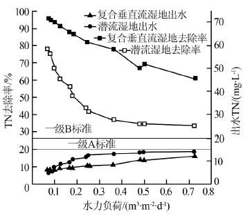 由圖 3可見,兩種人工濕地的出水TN指標(biāo)隨水力負(fù)荷增加而變差。水力負(fù)荷為0.725 m3/(m2·d)時(shí),潛流人工濕地TN去除率為33.29%,出水TN 14.01 mg/L,復(fù)合垂直流濕地去除率為45.65%,出水TN 12.01 mg/L,兩種人工濕地的出水均達(dá)到一級(jí)A(15 mg/L)排放標(biāo)準(zhǔn);水力負(fù)荷<0.2 m3/(m2·d)時(shí),復(fù)合垂直流TN去除率保持在60%以上,而對(duì)于潛流人工濕地,水力負(fù)荷<0.125 m3/(m2·d)時(shí),TN去除率保持在60% 以上。