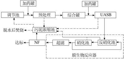本工程采用“預(yù)處理—UASB—A/O膜生物反應(yīng)器—NF”的污水處理工藝,工藝流程如圖 1所示。