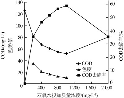 如圖 2~圖 4所示,初始pH對Fenton氧化反應的影響較大,當pH為2、6、7時,反應后出水COD高于生化尾水,出現(xiàn)這種現(xiàn)象的原因是pH過低或過高時,催化反應受阻,水樣中H2O2分解不完全,殘留的H2O2使測得的出水COD偏高。反應的最適pH為4~5。調(diào)節(jié)pH到4左右,當雙氧水投加質(zhì)量濃度達到600 mg/L時出水COD達到60.7 mg/L,COD去除率為51.8%,色度為12倍。繼續(xù)提高雙氧水的投加量,出水COD能達到60 mg/L以下,但對生化尾水的COD去除率提高較小。隨著FeSO4·7H2O投加濃度的加大,反應后上清液COD降低,當FeSO4·7H2O的投加質(zhì)量濃度達到150 mg/L時,其出水COD為59.0 mg/L可以達到設計排放標準。為了降低處理成本,可以適當降低雙氧水的投加量,提高FeSO4·7H2O的投加量。