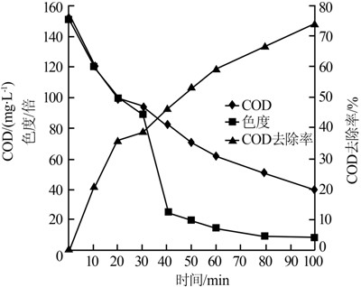 采用臭氧氧化處理生化尾水,分別在10、20、30、40、50、60、80、100 min時取樣,測定出水COD、色度,結(jié)果見圖 5。