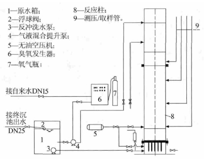 中試裝置進(jìn)水分別取自污水處理廠曝氣生物濾池和二次沉淀池出水,進(jìn)水流量為0.5 m3/h,水溫 25~30 ℃。進(jìn)水經(jīng)原水箱調(diào)蓄后由泵提升至BAC 柱(上部進(jìn)水、下部出水方式),反應(yīng)柱內(nèi)濾料采用顆;钚蕴,有效反應(yīng)時(shí)間2 h。利用氣液混合泵向進(jìn)水投加O3,投加點(diǎn)位于提升泵前,O3 投加量為15~35 mg/L,取BAC 反應(yīng)柱出水進(jìn)行測定,每日上午8∶30、下午2∶00 取水樣2 批,每批取3~4 次混合水樣。