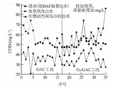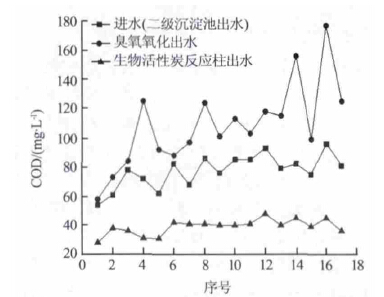 以二級沉淀池出水為進(jìn)水,進(jìn)行臭氧—生物活性炭試驗(yàn)(O3 投加量20 mgL),各單元出水COD 的平均值如表 2 所示。