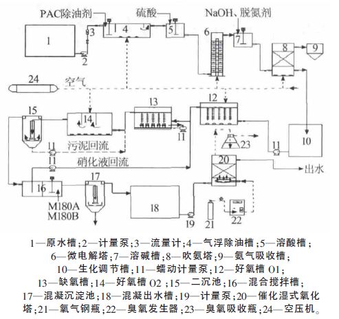 (1)經(jīng)過除油—微電解—吹氨聯(lián)合物化工藝預處理后,污染物濃度大幅度下降,COD 可達6 000mg/L 以下,氨氮可達200~300 mg/L;可生化性顯著提高,B/C 可由原來的0.1 提高至0.3~0.6,為后續(xù)生化處理奠定了堅實基礎。
