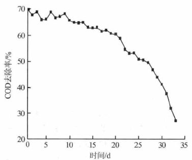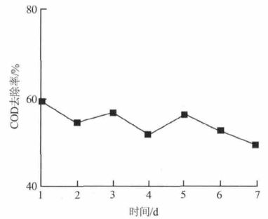 自制的鐵炭微電解填料主要利用了鐵的還原性、鐵的電化學性、鐵離子的絮凝吸附三者共同作用來處理蘭炭廢水。在酸性條件下,廢水通過填料時,鐵成為陽極,炭成為陰極,并有微電流流動,形成無數(shù)個小電池產(chǎn)生氧化還原反應,進而使有機物官能團發(fā)生變化;陽極產(chǎn)生的Fe2+可以生成Fe(OH)2、Fe(OH)3,具有較強的吸附及絮凝的能力,使廢水進一步澄清;陰極產(chǎn)生的H2具有還原性,可還原有機物進而降低廢水毒性,提高其可生化性。反復試驗證明自制的微電解填料解決了常見的結塊、鈍化及連續(xù)運行不穩(wěn)定等缺點,實現(xiàn)了微電解工藝的高效、穩(wěn)定運行,其對COD 的去除效果如圖 2 所示。