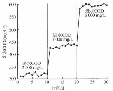 (3)運行效果。高效菌種適應性強,生長繁殖迅速,生存所需條件非常溫和。采用高效菌種結合O/A/O 工藝降解預處理后的蘭炭廢水,其對COD 的最高耐受能力可達6 000 mg/L。試驗過程中控制進水COD 在2 000~3 000 mg/L,COD 去除率高達90%以上,氨氮去除率達80%以上。試驗過程中筆者發(fā)現(xiàn)高效菌種在降解污水時的排泥量很少,SV30最高只有11%左右。隨著進水濃度的提高,COD、氨氮的去除率均有所降低。圖 3 為系統(tǒng)中COD 的變化曲線。最終生化出水的COD 為300~400 mg/L,氨氮為10~15 mg/L。