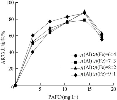由圖 2可知,在PAFC投加質(zhì)量濃度為14 mg/L,各鋁鐵比對AR73的去除率均達到最大,其中鋁鐵比為6∶4、7∶3、8∶2、9∶1條件下對應(yīng)的AR73去除率分別為87.7%、78.8%、88.9%、87.3%。此后隨著投藥量的增加,AR73的去除率開始下降。這可能是因為PAFC絮凝劑在中和染料的負(fù)電荷之后,過量的絮凝劑將染料包覆而使其形成帶正電的膠體,使它們相互之間產(chǎn)生排斥力而重新分散在水體中形成穩(wěn)定渾濁的體系,而使混凝效果降低。