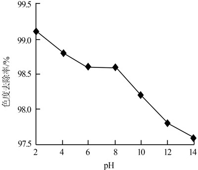 取500 mL容量燒杯7只,各加入400 mL的模擬染料廢水,每只燒杯中加入5 g改性后粉煤灰。用HCl和NaOH分別將廢水的pH調至 2、4、6、8、10、12、14。將燒杯放到攪拌器上攪拌,攪拌過程分為三個階段,第一階段轉速為250 r/min,攪拌時間為 1.5 min;第二階段轉速為150 r/min,攪拌時間為 5 min;第三階段轉速為100 r/min,攪拌時間為 20 min。攪拌完成后將燒杯依次放在桌面上靜置10 min,最后測定廢水的吸光度,計算色度去除率,確定最佳pH范圍。實驗結果見圖 1。